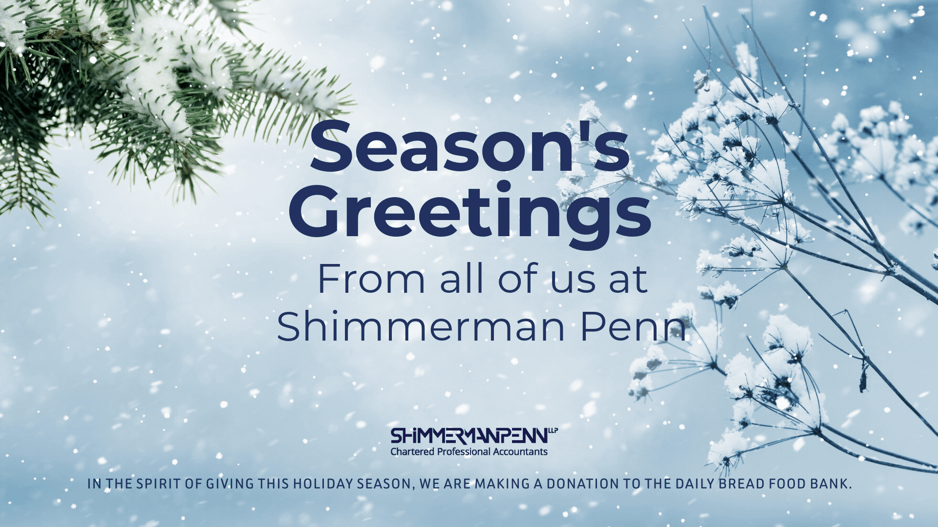 Warm wishes from everyone at Shimmerman Penn to our clients and friends. In the spirit of giving this holiday season, we are making a donation to the Daily Bread Food Bank.